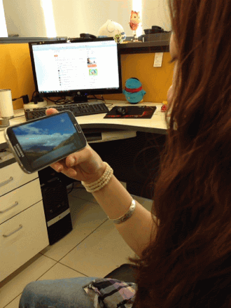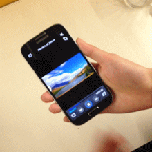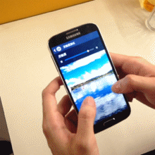 这次S4最大的亮点是可同时开启前、后摄像头进行拍照,在屏幕上看到的会是子母画面的呈现,母画面是后置摄像头、子画面是前置摄像头,而子画面可以任意重设大小或是放置的位置,还可以选择不同的框架、滤镜,甚至还可以把前、后置摄像头的画面对调,按下快门键后,就可以拍出一张具有前景与背景人物的照片。