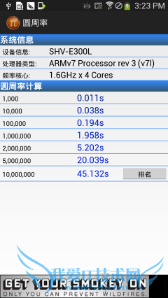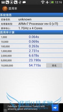 计算圆周率以往我们经常用在PC的CPU测试,现在Android手机也有相应的计算圆周率的应用。计算一千万位的测试,三星S4耗时45.132秒;HTC One耗时54.715秒,而HTC One这样的分数有点出乎意料,成绩甚至不如它的亲兄弟HTC Butterfly。按理来说骁龙系列处理器的浮点运算能力应该非常强大,与它搭在相同处理器的小米2S成绩就非常出色。