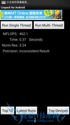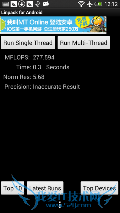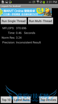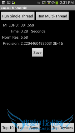 Linpack在国际上已经成为最流行的用于测试高性能计算机系统浮点性能的benchmark。通过利用高性能计算机,用高斯消元法求解一元N次稠密线性代数方程组的测试,评价高性能计算机的浮点性能。相对电脑而言,Android手机版的Linpack软件相对简化了一些,最新版只包含单线程与多线程两种测试。顾名思义,处理器的运算能力越强,分数就越高,双核甚至未来的多核处理器的优势,在多线程测试部分来有所体现,测试结果以浮点运算每秒(Flops)给出。三星S4 Linpack浮点运算测试成绩单线程301.559/双线程370.696;HTC One单线程227.594/双线程462.1。