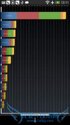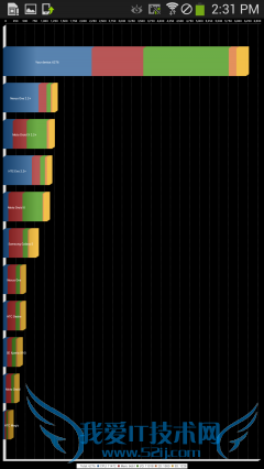Quadrant由Aurora Softworks公司开发,是一款元老级的移动设备性能测试工具,它所测试的范围包括12项CPU测试、1项内存测试、4项I/O测试、1项2D图形处理测试、3项3D图形处理测试,并最终反馈一个被测试设备的综合成绩。没有装备GPU单元的设备无法运行该软件。理论上分数越高,代表被测试设备硬件综合性能越强。三星S4得分为6276;HTC One得分为5872。