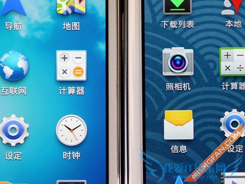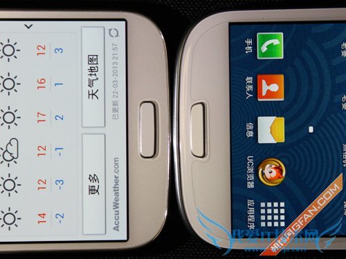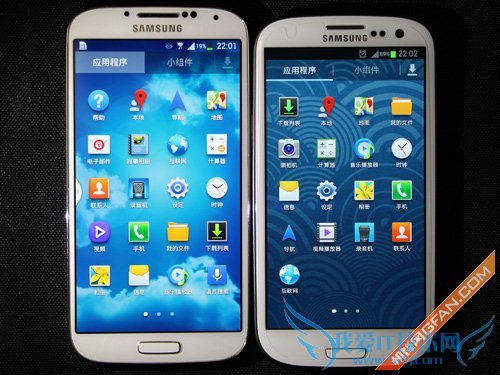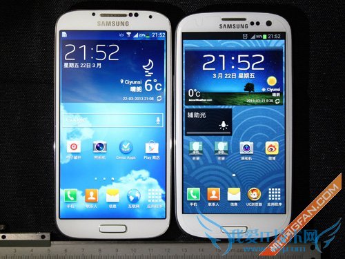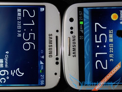 左:三星Galaxy S4 右:三星Galaxy S3 明显看出,三星Galaxy S4拥有更窄的屏幕边框,从而带来更加震撼的视觉冲击感。