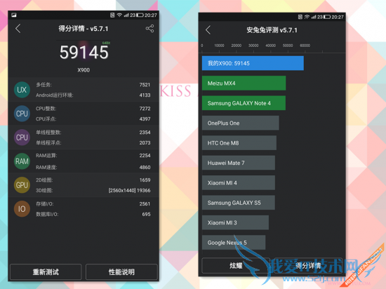 作为乐视首次发声的三款超级手机中的旗舰款,乐MAX的硬件配置可谓豪华。处理器自然选择当下最为强劲的高通骁龙810 8核64位方案,内存也是三者中的最大--4GB LPDDR4 RAM,彻底摆脱用久死机的尴尬。对于骁龙810,想必大家已是非常熟悉了,作为高通目前针对旗舰市场主打芯片,其最高主频为2.0GHz,采用了20纳米工艺制程,四颗Cortex-A57+四颗Cortex-A53所构成的8核架构,GPU亦为最强悍的Adreno 430。由于具备完美的LTE全网覆盖,所以乐MAX也实现了4G“全网通”。 下面就用最新的安兔兔5.7版跑个分吧,本次测试基于最新固件5.0.010E体验版。一共跑了三次,实测总分为59145分,近6W分的成绩可谓是笑傲群机了: