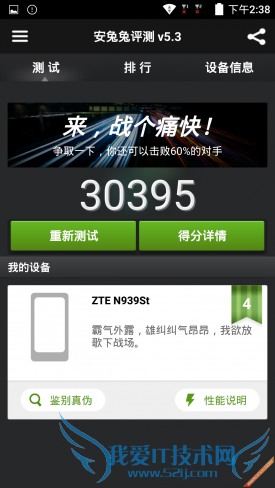 安兔兔评测AnTuTu Benchmark是一个专门给Android系统的手机、平板电脑硬件跑分的软件,它能一键运行完整测试项目,通过内存性能、CPU整数性能、CPU浮点性能、2D、3D绘图性能、数据库I/O、SD卡读、写速度等多项性能测试,并对手机的整体和单项硬件性能做出评分,同时上传分数并查看该设备在世界的排名。