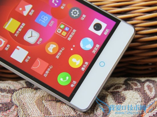 机身正面上方是部分传感器与500万像素前置摄像头,正面下方有着标志性的蓝色圆圈,它还具备呼吸灯的功能,开启后可提示电量低、错过事件等。在主页键的两侧,配有隐藏式按键,左右分别为菜单键和返回键,由于采用隐藏式设计初次上手的用户使用时会有点困难,但这样的设计同时也提升了正面的美观程度,难免有所取舍。
