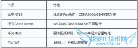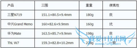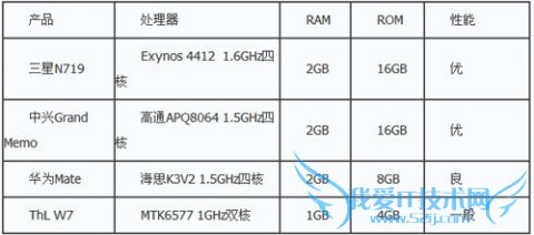 很有意思的是,本次的四款产品采用了完全不同四款处理器,且都很有产品自身的特色。比如三星N719和华为Mate都采用了自家的处理器,中兴Grand Memo搭载了主流高性能的APQ8064,而定位低端的ThL W7则是搭载MTK双核处理器,都比较符合各自的市场定位。