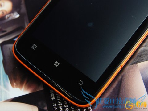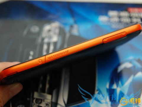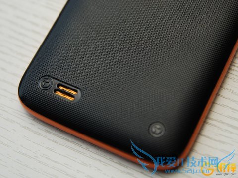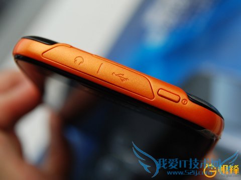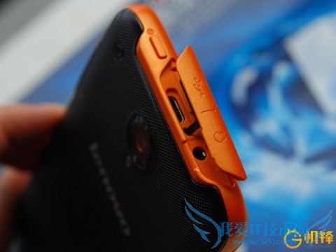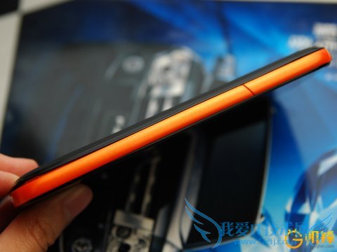 机身顶部的Micro USB插口和3.5mm耳机插孔都由保护盖紧紧扣住,旁边是电源键,电源按键比较小,有些不好操作。机身左侧没有按键及接口设计,右侧上部为音量按键。机身右侧下方是用来抠开后盖的小凹槽,后盖的拆卸不是非常方便,只能慢慢用手抠开。整个机身一周都采用橙色的条纹装饰,让手机显得美观且不单调。