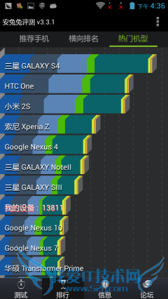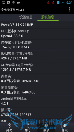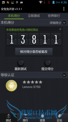 安兔兔系统评测AnTuTu Benchmark是一个专门给Android系统的手机、平板电脑硬件跑分的软件,它能一键运行完整测试项目,通过内存性能、CPU整数性能,CPU浮点性能、2D、3D绘图性能、数据库I/O、SD卡读、写速度等多项性能测试,并对手机的整体和单项硬件性能做出评分,同时上传分数并查看该设备在世界的排名。联想S750得分为13811, 与目前高通的一些高端双核芯片比较接近。虽然过万,但与目前市场主流四核手机还是有一定的差距。