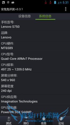 联想S750搭载联发科的MT6589四核处理器,主频为1.2GHz,而GPU方面则为单核的Power VR SGX544图形处理器。MT6589采用A7架构,该处理器基于台积电28nm工艺制造。一起通过跑分测试看看实际性能如何吧。