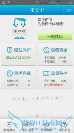 乐安全:可排查手机健康隐患,一键优化加速,清理病毒。黑名单功能,让垃圾短信和骚扰电话不再出现;手机丢失可以找回通讯录等数据,更可以远程遥控擦除所有数据,信息不泄露。儿童模式、访客模式防止误拨电话误发短信及隐私信息无意中泄露。