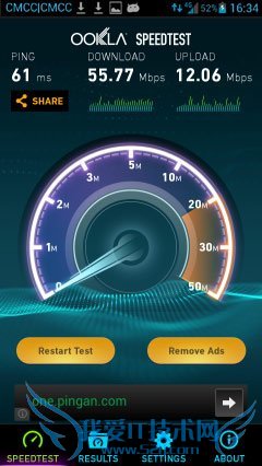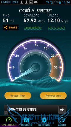 插入中国移动4G测试卡,使用Speedtest软件进行上传及下载速率测试,在同一地点进行两次测试,第一次测试结果为下载55.77Mbps,上传 12.06Mbps,经过单位计算转换,下载速度为6.97M/s,上传为 1.51M/s。第二次测试结果为下载57.92Mbps(7.24M/s),上传12.1Mbps(1.51M/s),结果没有太大的浮动,证明了在同一地点网络环境较为稳定。