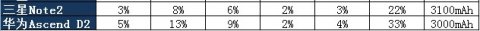 比起3100mAh的三星Note2 LTE版来说,华为Ascend D2 TD-LTE版耗电速度更快,看来处理器及系统优化方面稍显不足。另外,3000mAh的大容量电池对手机的充电能力提出了挑战,按照正常的充电能力,3000mAh时大概要充四个小时以上,但如果使用华为2A充电器的话,两个小时之内就可以搞定。