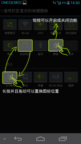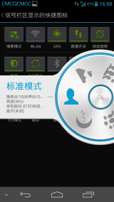 下拉通知栏快捷方式内包括WLAN、接入点、数据开关、自动旋转等多个常用设置的开关,便于用户日常使用。值得一提的是,在下拉通知栏快捷方式最左端还有一个“情景模式”快捷方式,点击可进入情景模式切换界面,点击“转盘”上方的“OK”则可完成情景模式的选择。