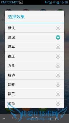 另外,在桌面空白处长按可调出“设置桌面”菜单,除了常规的壁纸、窗口小工具、缩略图之外,还拥有一个“切换效果”子菜单,用户可以从中选择桌面界面之间的切换效果,其中包括风车、旋转以及滚筒等多个炫丽切换效果。