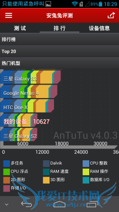 安兔兔评测AnTuTu Benchmark是一个专门给Android系统的手机、平板电脑硬件跑分的软件,它能一键运行完整测试项目,通过内存性能、CPU整数性能、CPU浮点性能、2D、3D绘图性能、数据库I/O、SD卡读、写速度等多项性能测试,并对手机的整体和单项硬件性能做出评分,同时上传分数并查看该设备在世界的排名。