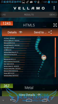 Vellamo是一个基准测试应用,它可以让你对手机浏览器的性能及稳定性进行测试,包括像Java脚本性能、渲染、联网和用户界面等。该工具的结果同样包括多个子项,但我们只取总成绩,分数越高则表明手机对浏览器的优化程度越高,网页浏览体验更好。