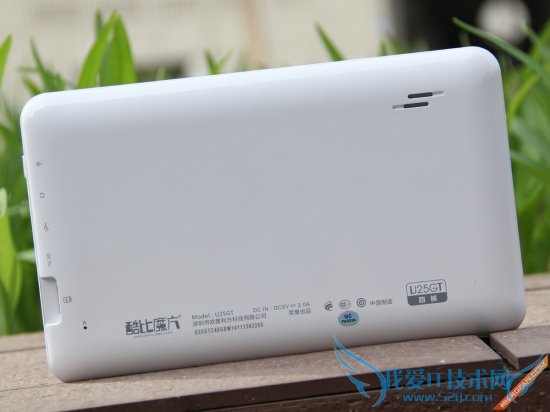 酷比魔方U25GT(四核版)的机身背面设计非常简洁,除了印有酷比魔方的品牌标志和产品信息外,还设计了一枚独立扬声器,可以为消费者提供很好的外放效果。
