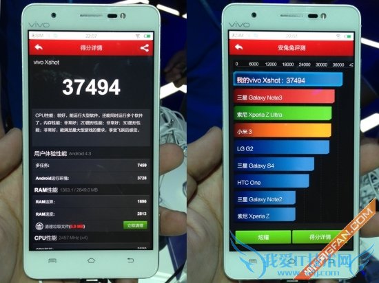 在上面,笔者曾提到vivo Xshot分为“旗舰版”和“精英版”两种,而本次发布会中笔者体验的就恰恰是这款vivo Xshot的旗舰版,它搭载2.5GHz高通骁龙801四核处理器(MSM8974AC),配备3GB RAM+32GB ROM。单从配置来看就很是彪悍,那么接下来就用安兔兔跑下分看看吧!