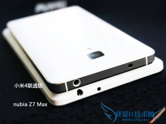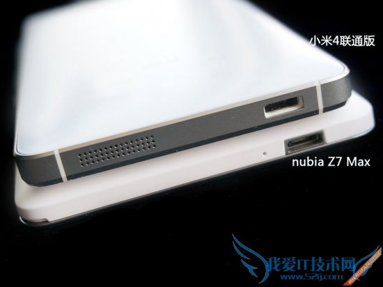 在机身顶部设计上,两部手机大同小异,均配备了3.5mm耳机接口及红外接口,可遥控家里电视、空调等支持红外协议的家用电器。而机身底部,则可以看到micro USB接口、麦克风孔。除此之外,在小米4的机身底部还可以看到密集的扬声器。值得一提的是,nubia Z7 Max的MicroUSB接口加入了一个金属框框,使得机体有着更强的耐插拔能力。