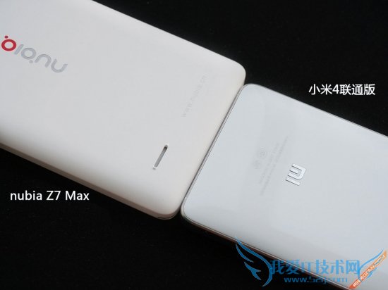 nubia Z7 Max背面中间和和下部分别设置了nubia的字母LOGO和外放扬声器孔,扬声器孔有微微突起,防止手机放在平面物体上时扬声器孔被堵住。而小米4的机身背部下方,则可看到品牌LOGO和认证信息。