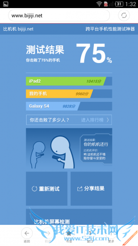 比机机(BIJIJI)是一款跨平台手机测试工具,它为Android、iOS和Windows Phone等移动设备提供性能测试,性能排行等功能。让用户可以很清晰的了解自己的手机性能所处的位置。