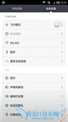在设置菜单中,nubia Z7 Max采用了分栏模式,让菜单看起来更加的直观、突出。而小米4的设置界面,是将菜单设置进行分类管理,分为常用设置和全部设置。