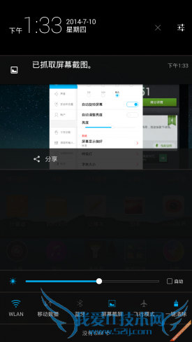 nubia Z7 Max下拉通知栏采用单页模式,快捷开关在屏幕下方,带有屏幕亮度调节,上方则为通知页。小米4的通知栏则采用通知、开关双页设计,左右滑动可切换页面。