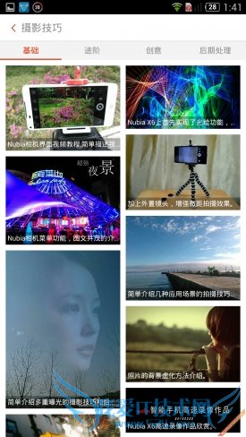 另外,nubia Z7 Max还内置了摄影技巧教程,分为基础、进阶、创意、后期处理器四部分,每部分有一些精选文章,用户可以通过此种方式,进一步增强手机拍摄能力。