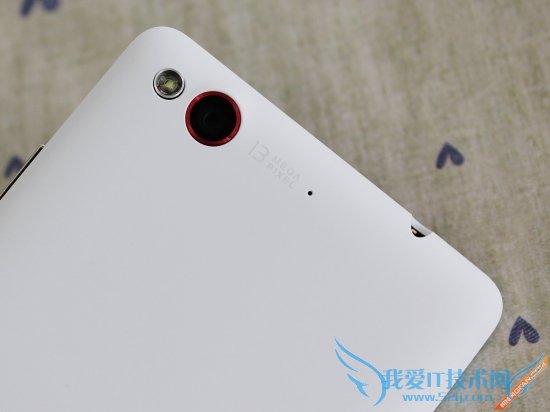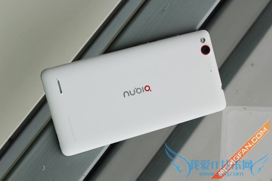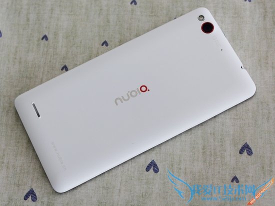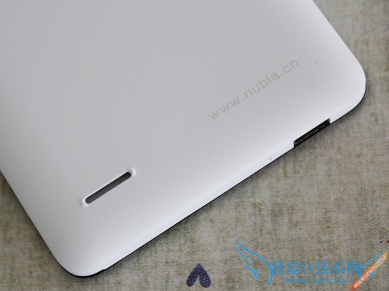 nubia Z7 mini的机身后盖设计延续了上一代小牛2的风格,白色塑料制成,给人一种干净整洁的气息。在后盖上端左侧是一枚1300万像素摄像头,配备单LED补光灯,值得称赞的是该摄像头并未采用凸起设计。机身背面的中间是nubia的产品LOGO,采用金属镶嵌工艺,固定在后壳中心位置。背面下方是独立扬声器和nubia的官方网址。