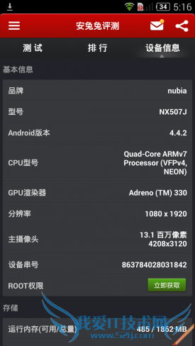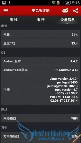 众所周知,nubia的产品拥有拍照、性能、价格三大特色,而目前旗下小牛系列已经发展到了第三代,产品除了外观和系统,性能上也在不断的升级和完善。在硬件方面,nubia Z7 mini搭载高通骁龙801(MSM8974AA)四核2.0GHz处理器,运行Android4.4操作系统,配备2GB RAM+16GB ROM,这个配置完全可以放在现如今高性能的手机行列中,接下来我们通过软件来看一下它的性能表现。