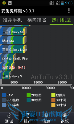 超级兔子系统评测AnTuTu Benchmark是一个专门给Android系统的手机、平板电脑硬件跑分的软件,它能一键运行完整测试项目,通过内存性能、CPU整数性能,CPU浮点性能、2D、3D绘图性能、数据库I/O、SD卡读、写速度等多项性能测试,并对手机的整体和单项硬件性能做出评分。同时上传分数并查看该设备在世界的排名。