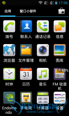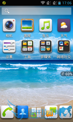 对于主界面上的设计华为G350也十分简单,顶部是常规的状态条其下面便是搜索栏,该机的搜索栏并不像其它手机一样是窗口小部件方式呈现,而是直接固定在主界面上的。图标展示采用的也是常规的单屏十二图标方式。
