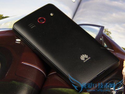 在机身背部上方为后置的一颗500万像素摄像头,摄像头右侧配有一枚LED补光灯,摄像头左侧是经过防水处理的外置扬声器,在底部则是“HUAWEI”的LOGO标志。