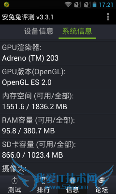 之所以将AnTuTu的成绩放在第一位,是因为它不仅能够展现硬件的综合实力,同时还提供细分项成绩,可进行对照参考。RAM表示机器的对于数据运算的吞吐能力、CPU整数/浮点性能代表处理器的运算能力、2D/3D绘图性能表示图形处理芯片对图像的渲染能力、数据库I/O性能表示处理器与RAM对数据库的访问效率、SD卡写入/读取速度则表明机身ROM的可读写能力(目前该项测试需要ROM空闲空间大于300MB,因此若机身存储空间/ROM不足300MB,则忽略该项成绩,但总成绩要扣除相对应分数)。理论上分数越高,则表示该项性能越强。