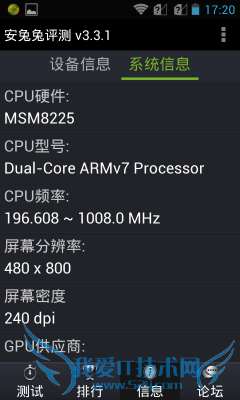 在硬件配置上,华为G350搭载了一枚主频1GHz的高通骁龙MSM8225双核处理器,并为其配备了512MB的RAM以及4GB ROM的标准组合。虽然说目前双核处理器早已不是主流,但鉴于其三防定位来说,双核处理器也还是较为不错的选择起码可以降低部分成本让用户更像优惠,下面我们将通过几款常规性能测试软件进行一下跑分测试。