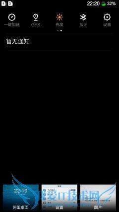 通常我们都会认为长按HOME键就可以进入多任务管理界面,但在优米CROSS大红牛中,优米进行了改善,用户通过下划调出通知任务栏,就可以对多任务界面进行管理。