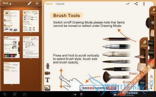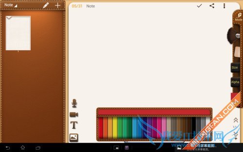 在编辑区域有一个功能栏,从上到下分别是手写笔的种类选择、橡皮、大小调节、透明度和颜色选择。操作很简单,比如软件默认的是一根铅笔,我们只要将手指按住铅笔然后向上或者向下滑动,就可以选择其他的种类,这里面有蜡笔、毛笔、钢笔以及笔刷等。