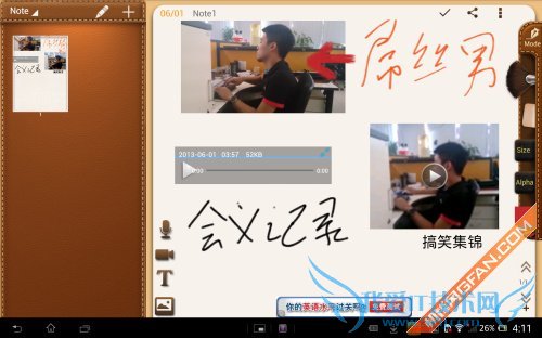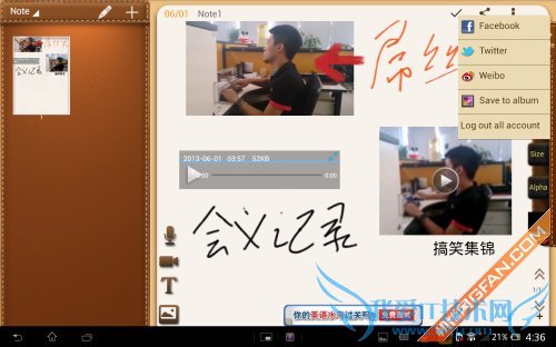 当然我们也可以添加图片、视频和文字,都是通过点击左侧的图标来完成,然后根据自己的需要,在工具栏内选择合适的颜色来改变文字的效果。这样一个完美的笔记就出现了,各种现实的笔记展现在一个页面,相当有成就感。