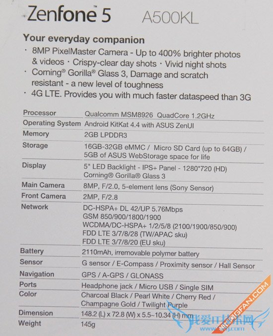 网络方面,华硕ZenFone 5 A500KL支持EDGE、DC-HSPA+ 42Mbps、WCDMA,还支持FDD LTE,整体配置十分值得期待。