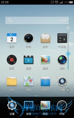 进入主界面,MX2 TD版整体UI依旧清新脱俗,魅族向来都是将所有程序放在桌面的设计,并没有特定的程序列表,使用起来较为方便,没有庸俗感。桌面图标操作方式和大多Android手机都一样,长按图标可以实现拖动、删除、合并等功能,实际操作起来一目了然。