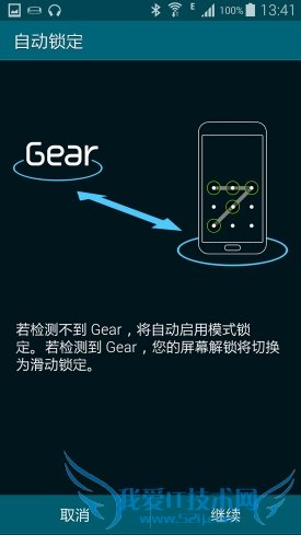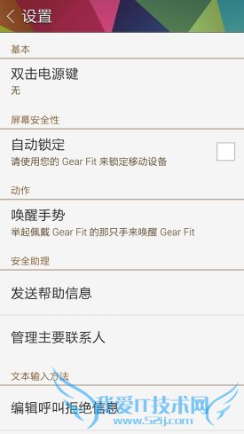 在设置中,用户不仅可以自行设置三星Gear Fit的唤醒方式,还可以设置自动锁定功能。开启自动锁定功能后,当手机与三星Gear Fit断开连接后就会自动启动模式锁定,手机需要输入解锁密码才能解锁。若手机与三星Gear Fit始终连接则可以滑动解锁手机,提高了手机的安全性。