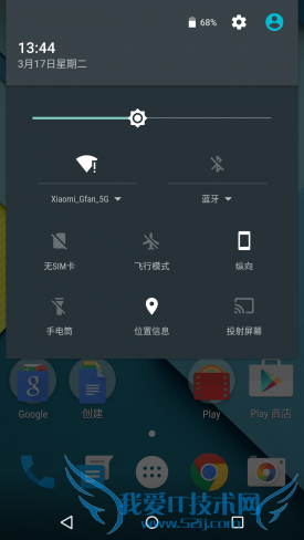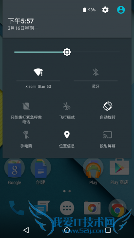 在通知栏快捷方式处,可以看到5.1系统中Wi-FI和蓝牙图标右下方有一个倒三角标志,点开这个倒三角就会进入到快捷设置界面,用户可以直接在这里设置选择连接Wi-Fi和蓝牙。