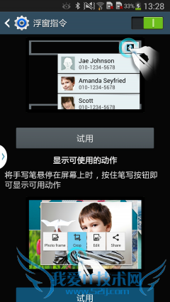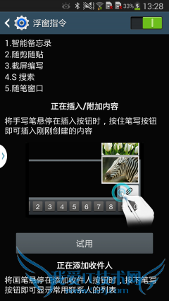 S Pen笔是三星Note系列手机的一大传统卖点,他的强大之处在于不仅可以实现全新的输入方式,而且可以作为控制设备存在,而Note3搭载的全新的S Pen笔又实现了一些新的功能。将S Pen悬浮停留在屏幕上方,并轻按笔杆的按钮,即可进入“浮窗指令”(Air Command)界面,其内含的5项强大功能可以真正令任务处理更加轻松、便捷。有了“浮窗指令”,用户就无需在屏幕上反复切换,也无需记住各种命令或查找各种菜单。“浮窗指令”能让用户访问以下主要功能: