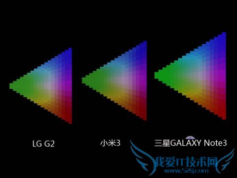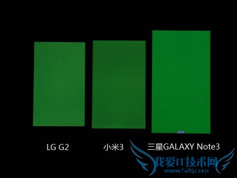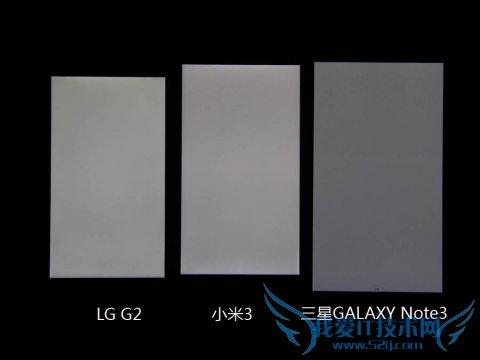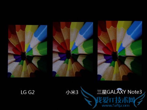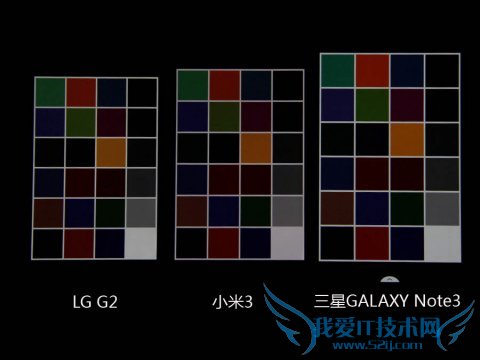 在色彩还原程度测试方面,通过色块对比可以明显感觉三星Note3的色彩相比较另外两款产品颜色有所偏差,特别是Note3对绿色以及蓝色色彩部分的还原程度要弱于LG G2和小米3,LG G2的表现依旧最好。