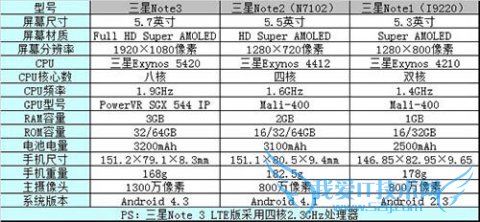 通过三代产品的对比,我们可以发现,GALAXY Note3在屏幕尺寸、分辨率、处理器、内存、摄像头、电池等核心配置方面都进行了升级。采用了更大的5.7英寸的1080P分辨率屏幕、高通骁龙800四核2.3GHz处理器,拥有3GB RAM内存,电池容量为3200毫安,整体配置已经达到了目前智能手机的顶级水平。