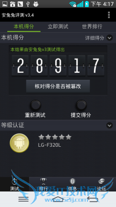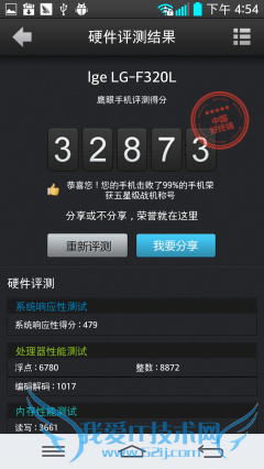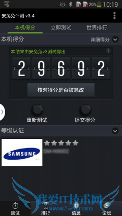安兔兔评测AnTuTu Benchmark是一个专门给Android设备的手机、平板电脑硬件跑分的娱乐软件,它能一键运行完整测试项目,通过“内存性能”、“CPU 整数性能”,“CPU浮点性能”、“2D、3D绘图性能”、“数据库IO”、“SD卡读、写速度” 8项性能测试对手机的硬体性能做出评分。测试结果三星Note3得分29692、LG G2得分为28917。