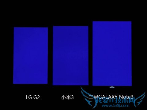 从纯色图片对比来看,小米3的显示白色图片的色彩最接近真实,LG G2和三星Note都有不同程度的偏黄现象,而且Note3要更明显一些;而在显示蓝、红、绿时情况则完全发生变化,三星Note3的色彩最为饱满,其次是LG G2,小米3的效果要差一些。