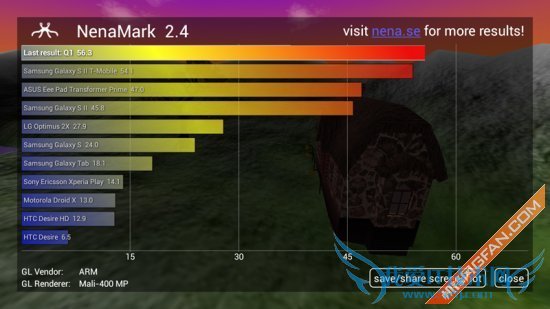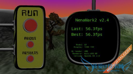 NeanMark2测试:是一款用于Android设备的硬件加速基准测试程序,通过演示一款实时渲染的画面来对手机的图形能力进行测试,包括反射、动态阴影、曲面参数、复杂光线模式等内容,需要Android 2.0以上系统和OpenGL ES 2.0支持。成绩:56.3fps