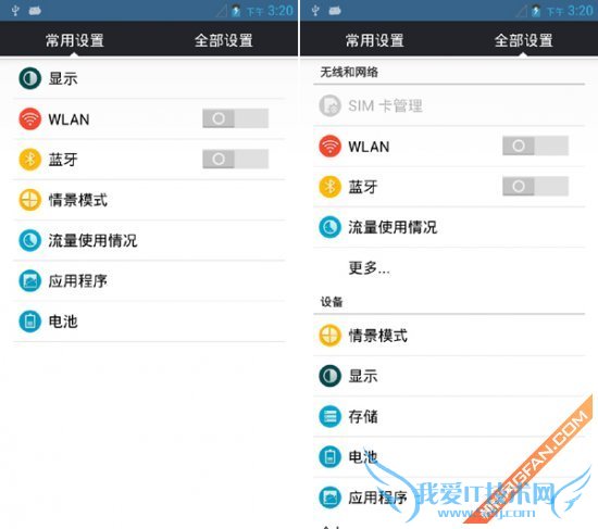 系统设置:该界面采用了双页面设计,左侧为常用设置,适合普通消费者快速设置调节;右侧为全部设置,内置的设置选项非常全面,适合专业手机玩家操控。