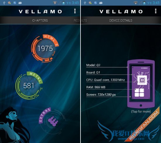 Vellamo是由Qualcomm(高通公司)开发的一个基准测试应用(类似于Neocore),它可以让你对手机浏览器的性能及稳定性进行测试,包括像Java脚本性能、渲染、联网和用户界面等。该工具的结果同样包括多个子项,但我们只取总成绩,分数越高则表明手机对浏览器的优化程度越高,网页浏览体验更好。Vellamo浏览器测试成绩HTML5为1975分,METAL为581分。