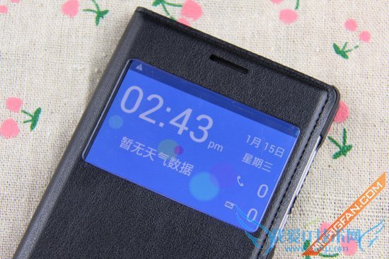 视窗皮套是专门为大Q手机Q1定制的智能皮套,在盖上皮套盖之后,在小视窗上会显示出时间、天气、日期、未接电话、未接短信。